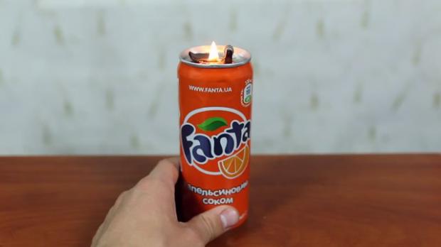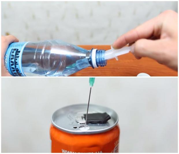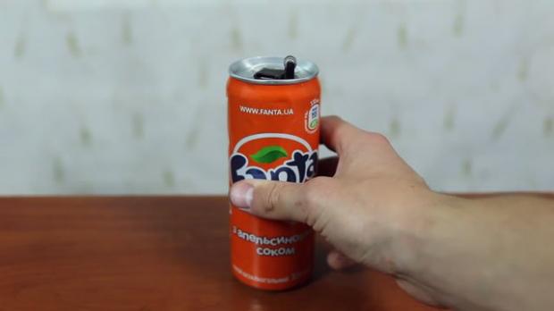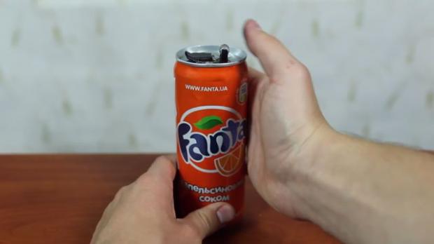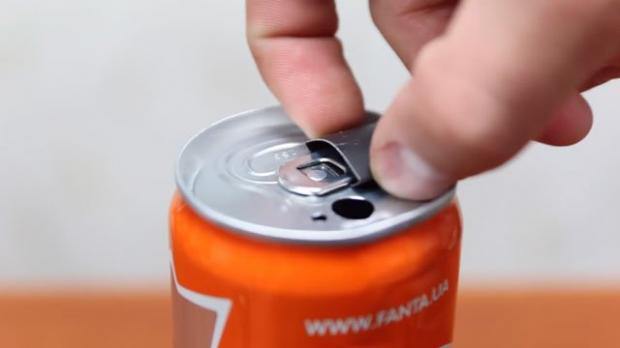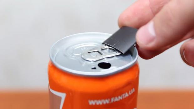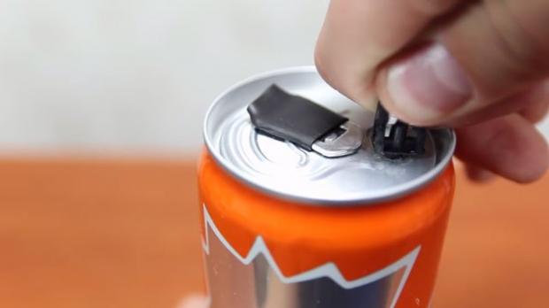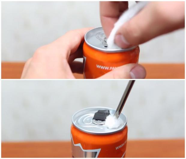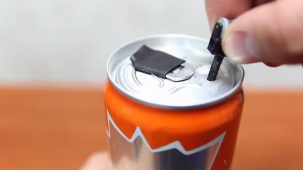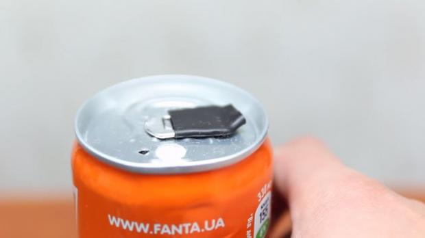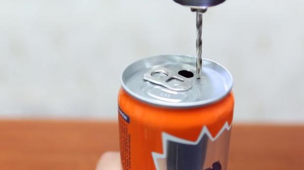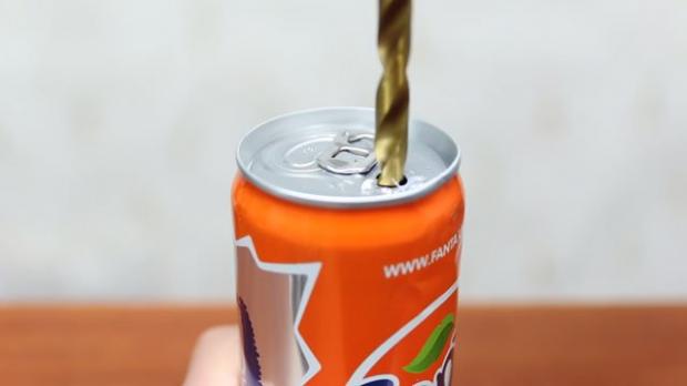 Và nhét nó vào lỗ khoan nhỏ còn lại trên lon nước.