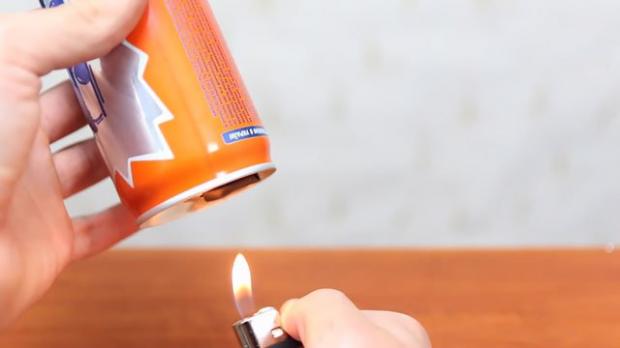 Sau đó bạn hãy dùng bật lửa để hơ nóng miếng cao su sao cho nó dính chặt vào nắp lon nước.