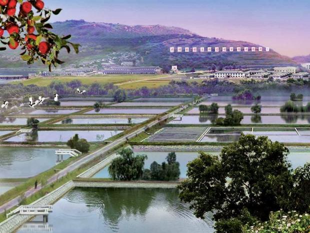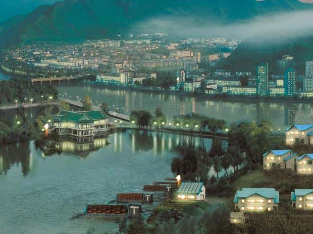 Bức ảnh thứ hai thể hiện đất nước Triều Tiên thanh bình và hiện đại bên dòng sông Pyongyang vào buổi tối với ánh điện huyền ảo, mặt nước phẳng lặng.
