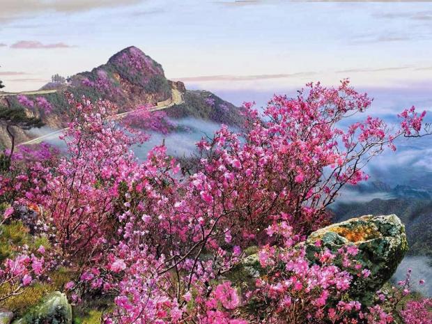 Những bụi hoa đỗ quyên tuyệt đẹp trên một con đèo ở Triều Tiên.