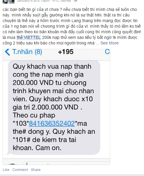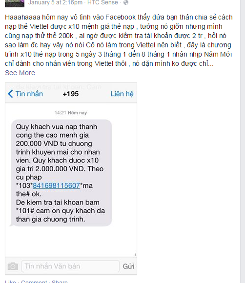 Những nội dung được tung ra chủ yếu như: “Nhân dịp kỉ niêm 70 năm ngày thành lập Quân đội nhân dân Việt Nam 22/12/1944 - 22/12/2014. Từ ngày 1/12/2014 đến ngày 22/12/2014 nhân viên công ty của Viettel sẽ được nhận một mã số bí mật, khi nạp tiền vào tài khoản thông qua mã số bí mật ấy sẽ được khuyến mại x10 giá trị thẻ nạp được. Tin này chỉ trong nội bộ Viettel mới biết. Nhà mình có người làm ở viettel và đã hướng dẫn mình vừa nạp 1 cái thẻ 100k thử trước thấy được mình mua thêm cái thẻ nạp tiếp, tài khoản của mình hiện tại là 2 triệu rồi”. Các bước hướng dẫn nạp tiền cũng được ghi đầy đủ. Thậm chí còn có lưu ý cho cả người nạp “mỗi sim chỉ nạp được 1lần duy nhất. Tài khoản gốc bạn phải có ít nhất 1000vnđ mới thực hiện đc nhé! Đây là cơ hội hiếm nên các bạn làm ngay đi”.