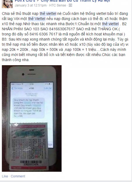 Để nhận khuyến mại, người dùng được hướng dẫn cú pháp nạp thẻ, trong đó dãy số bí mật để xác thực là nhân viên của Viettel như “quảng cáo” chính là số điện thoại của kẻ xấu. Khi người dùng thao tác theo cú pháp kẻ xấu cung cấp, số tiền người dùng nạp được chuyển thẳng đến số điện thoại nói trên.