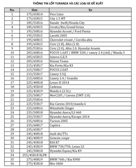 Khách hàng có thể tham khảo thêm thông tin lốp phù hợp trong bảng dưới đây , hoặc gọi đến hotline của Bridgestone tại số 1900 54 54 68.
