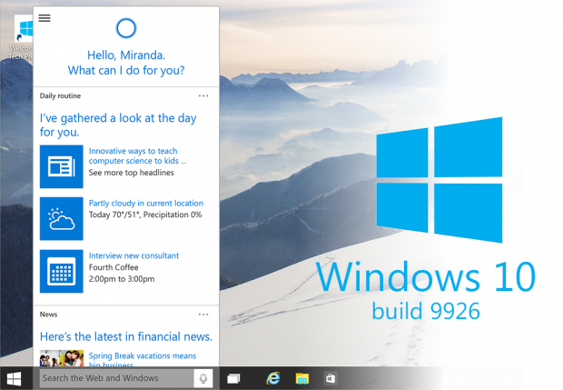 Không lâu sau khi Microsoft giới thiệu Windows 10, hôm nay hãng bất ngờ cho người dùng tải về bản Windows 10 Technical Preview bản build 9926 có hầu hết các tính năng mới như Start menu có khả năng phóng to đầy màn hình, trợ lý ảo Cortana, chế độ Continuum chuyển giữa desktop và tablet, ứng dụng Settings mới, khu vực Action Center kèm theo công cụ quick settings để bật tắt nhanh các kết nối thường dùng. Windows Store, Music, Photos và một vài ứng dụng khác cũng được cập nhật theo kiểu 'universal app'.