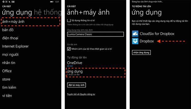 Để kích hoạt tính năng bạn vào Cài đặt > Ứng dụng > Ảnh+máy ảnh > Tự động tải lên và chọn Dropbox làm ứng dụng mặc định.