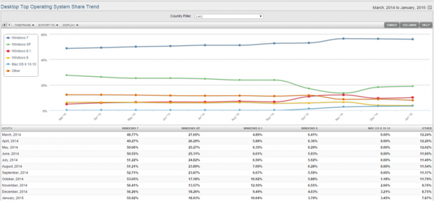 Theo thống kê của công ty nghiên cứu thị trường NetMarketShare cho biết trong tháng Một đầu năm 2015, Windows 7 vẫn tiếp tục hiện diện trong hơn phân nửa số máy tính cá nhân trên toàn thế giới và chiếm đến 56,40% thị phần, chỉ giảm 0,49% so với mức cao nhất là 56,41%. Trong khi đó, số người dùng Windows XP lại có sự phục hồi và tăng trở lại mức 18,93% sau đợt giảm mạnh vào tháng Mười một năm ngoái. Windows 8.1 tăng từ 9,49% lên 10,04% nhưng vẫn thấp hơn đáng kể so với mốc 12,1% của tháng Mười một 2014 trong khi thị phần Windows 8 vẫn tiếp tục thu hẹp chỉ còn 3,79% và nguyên nhân có thể vì người dùng hệ điều hành này đã cập nhật lên phiên bản mới nhất Windows 8.1.