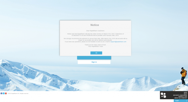 Sau chân Megaupload, RapidShare mới đây đã đăng trên trang chủ của mình thông báo dịch vụ lưu trữ dữ liệu của RapidShare sẽ chính thức đóng cửa vào ngày 31/3/2015, sau ngày này toàn bộ tài khoản người dùng và dữ liệu lưu trữ sẽ bị xóa hoàn toàn. nếu bạn đang có dữ liệu quan trọng lưu trên RapidShare thì nên nhanh chóng tải về lưu trữ.