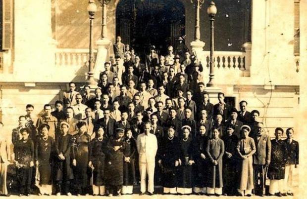 Bác Hồ (áo trắng, đứng giữa) chụp hình lưu niệm với các doanh nhân ngay sau khi Việt Nam tuyên bố độc lập.