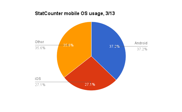 Tuy nhiên,StatCountercũng đã tiến hành nghiên cứu tương tự nhưng lại cho kết quả hoàn toàn khác, Android áp đảo iOS. Sự khác nhau này có thể là do phương pháp tiến hành khác nhau.
