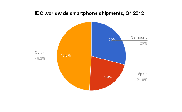 Samsung, tuy không phải là nhà sản xuất duy nhất sử dụng nền tảng Android nhưng về căn bản các mẫu điện thoại smartphone của Samsung đều chạy trên nền Android. Và heo IDC, trên phạm vi toàn cầu, Samsung đứng đầu danh sách này trong quý 4 năm ngoái, và Apple ở vị trí thứ 2.
