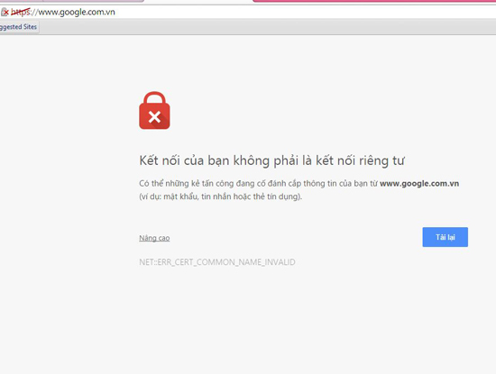 Nếu gõ thêm chữ “s” để truy cập theo giao thức https thì nhận được thông báo “Kết nối của bạn không an toàn. Kẻ tấn công có thể đánh cắp thông tin”. Thiết lập an toàn (https) trên trình duyệt bị gạch đỏ. Lỗi này cũng gặp phải tương tự khi truy cập từ điện thoại. Hiện tượng này gặp phải khi Chứng thư số (Digital Certficate) cho tên miền không đúng với tên miền đó.