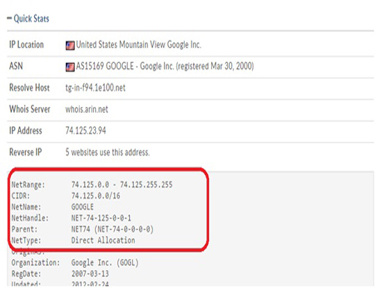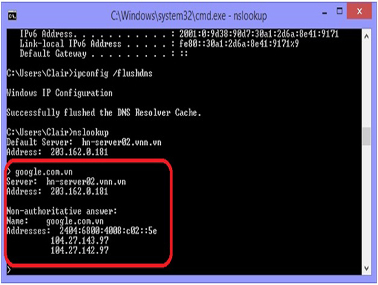 Khi tiến hành truy vấn tên miền theo domain Google.com.vn, tra ra thông tin địa chỉ IP: “104.27.143.97”.