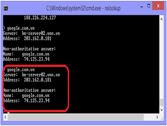 Tới khoảng 14h ngày hôm nay, 23/2/2015, hiện tượng trên không còn lặp lại. Khi nhân viên kĩ thuật Bkav kiểm tra tên miền Google.com.vn, đã hiện thị địa chỉ IP “74.125.23.94”, đây là địa chỉ IP của Google.