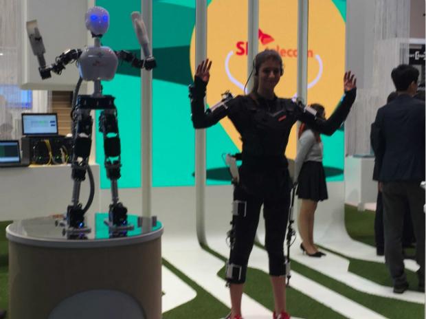 Ngoài ra, SK Telecom còn trình làng mẫu robot này. Nó có khả năng bắt chước theo các hành động của người phụ nữ ở bên phải.