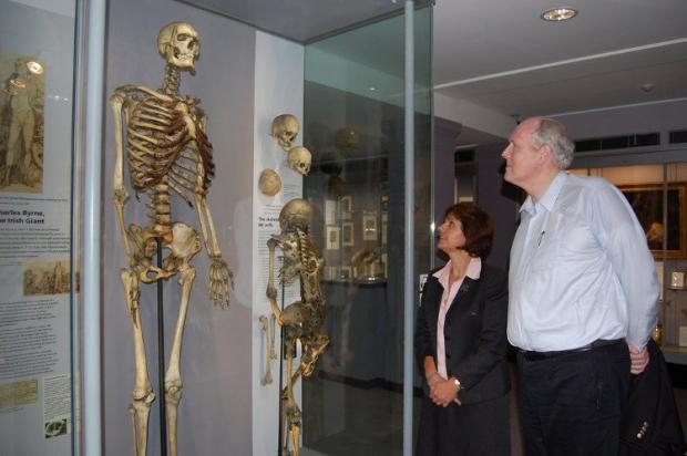 Bộ xương của 'người khổng lồ' Charles Byrne (ngoài cùng bên trái) tại bảo tàng London.