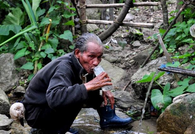 Hàng ngày, ông Châu chỉ ăn hai bữa chủ yếu là cơm gạo rẫy và rau rừng. Để có nguồn nước uống, nấu ăn, tắm rửa hàng ngày, ông dùng ống lồ ô kết nối làm máng dẫn nước từ suối về trước căn chòi sử dụng.