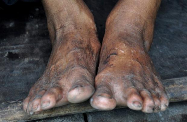 Ngược xuôi với cuộc sống hoang dã, đôi bàn chân ông Châu chai sần, lúc nào cũng lấm lem bùn đất.