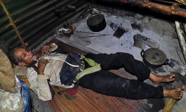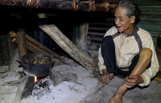 Về đêm, ông ngủ bên gian bếp chật hẹp của căn chòi.