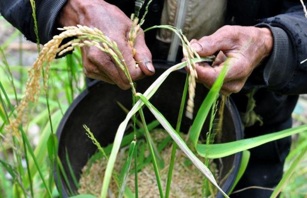 Mùa thu hoạch, ông tuốt lúa bằng đôi bàn tay sau đó mang về 'mái ấm' của mình để trên giàn bếp sấy khô, dự trữ ăn dần.