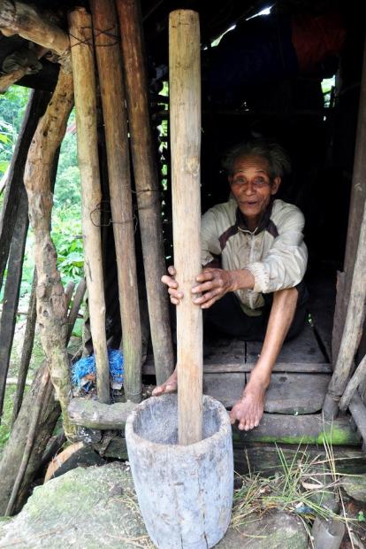 Ông đục đẽo cây rừng làm chày, cối giã lúa thành gạo để nấu ăn.