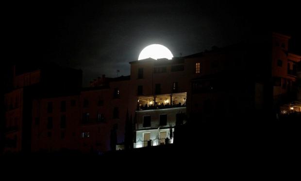Khi Trái Đất, Mặt Trời và Mặt Trăng thẳng hàng, hiện tượng này gọi là sóc vọng. Khi sóc vọng trùng với cận điểm, tức ba thiên thể nằm thẳng hàng trong đó Mặt Trăng ở gần Trái Đất nhất, siêu trăng xuất hiện. Siêu trăng nhô lên phía sau một căn hộ ở Ronda, phía nam Tây Ban Nha. (Ảnh: Reuters).