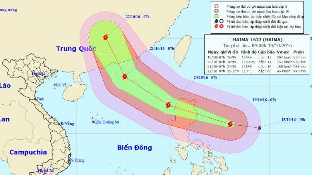 Hồi 04 giờ ngày 17/10, vị trí tâm bão ở vào khoảng 16,9 độ Vĩ Bắc; 115,2 độ Kinh Đông, cách quần đảo Hoàng Sa khoảng 320km về phía Đông.