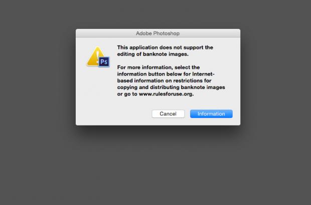 Khi mở một bức ảnh tờ tiền 100 USD trên Photoshop, người viết nhận được dòng thông báo 'This application does not support the editing of banknote images' (tạm dịch: 'Phần mềm này không hỗ trợ việc chỉnh sửa hình ảnh tiền giấy') và dẫn tới một liên kết có các tài liệu pháp luật liên quan tới vấn đề tiền giả.