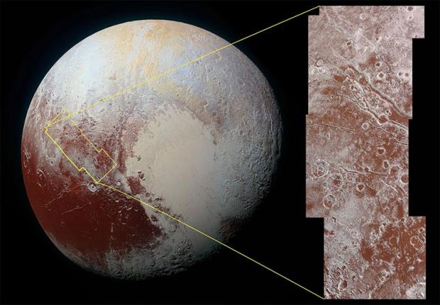 Diêm Vương tinh có các mảng màu đỏ rất đậm và cục gạch mà New Horizons sắp chạm trán còn đỏ hơn.