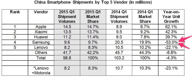 Theo đó, so với quý 1 năm ngoái, Apple đã có tốc độ tăng trưởng lên đến 62%. Trong khi đó, đối thủ cạnh tranh số 1 của hãng hiện nay là Samsung lại có sự suy giảm 53% so với năm 2014. Ngoài ra, một số hãng sản xuất thiết bị cầm tay khác như Xiaomi và Huawei cũng có được sự tăng trưởng 42 và 39% tương ứng. Điều này phần nào cho thấy rằng, so với hầu hết các hãng sản xuất khác, Samsung đều đang tỏ ra vô cùng yếu thế.