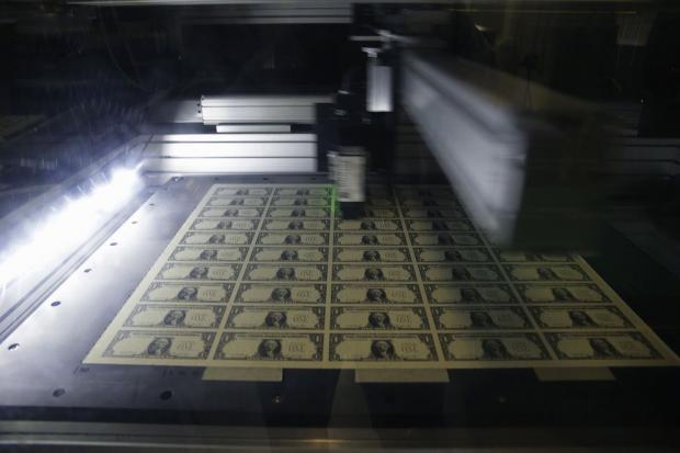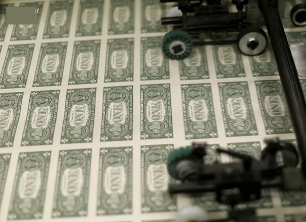 Các trang giấy in chuẩn bị được cắt thành từng tờ tiền 1 đô la.