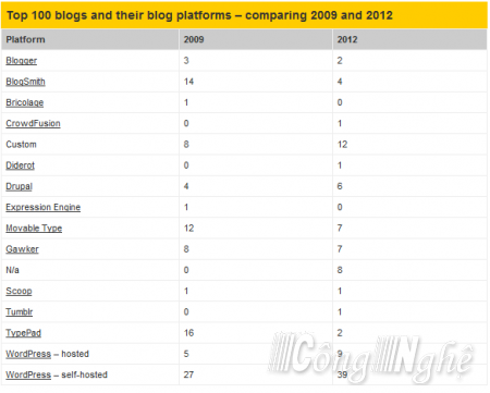 Khi so sánh kết quả thống kê giữa năm 2009 và 2012 trên tổng số 100 blog phổ biến nhất, có một số điểm cần lưu ý