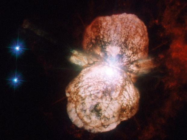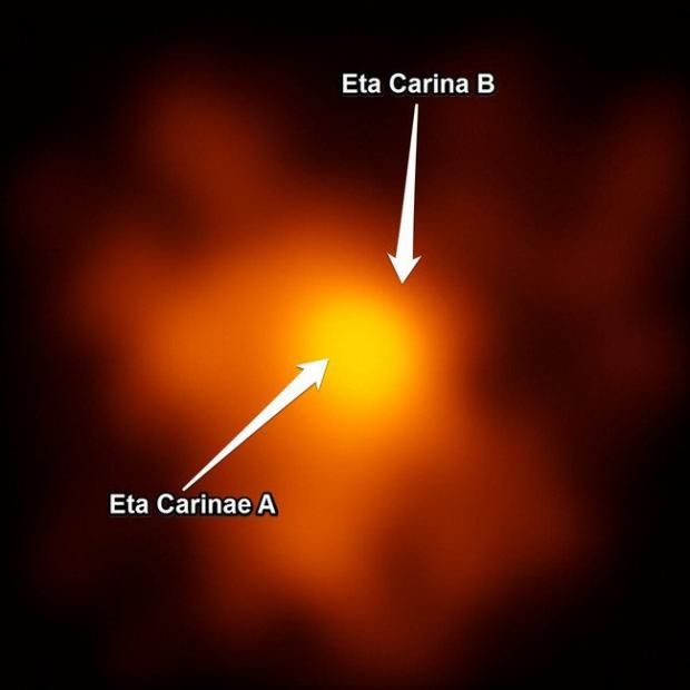 Hình ảnh không thực sự rõ ràng, nhưng xác nhận trận chiến dữ dội trên Eta Carinae. Mỗi ngôi sao bên trong hệ sao đôi này giải phóng những cơn gió phân tử cực mạnh, đẩy nhiệt độ lên mức 50 triệu độ C. Gió bụi và khí từ hai bên tạo thành tinh vân hình quả tạ bao quanh cả hai ngôi sao.