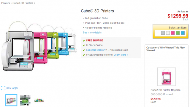 Và giá thành cho một chiếc máy in 3D là 1300 USD.Chiếc máy in này có tên Cube 3D Printer . Nó có thể in các vật thể có kích thước tối đa 5.5 inch cho chiều cao, chiều dài và chiều rộng với 16 màu đơn. Máy hiện có 5 màu là xanh dương, xanh lam, hồng, trắng và bạc để khách hàng chọn lựa.