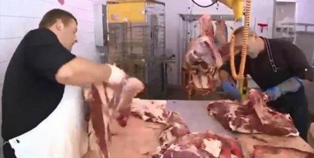 Thịt bò được cắt theo từng bộ phận bằng máy móc hiện đại, chuyên nghiệp.
