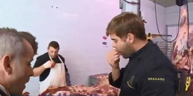 Anh cùng đồng nghiệp nếm thử thịt bò tươi ngay tại lò mổ để đánh giá chất lượng trước khi chuyển sang bước làm đông.