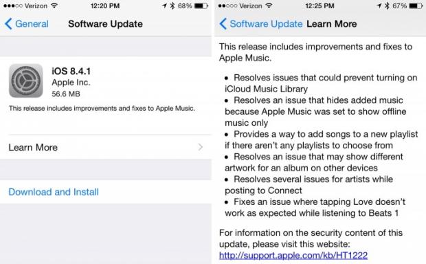 Đặc biệt là với Apple Music, bản cập nhật này sẽ giúp khắc phục tình trạng mất kết nối, không hiển thị thông tin nghệ sỹ, bổ sung tùy chọn trong playlist... Người dùng có thể nâng cấp lên iOS 8.4.1 bằng cách mở Settings > General > Software Update và bản cập nhật này sẽ có dung lượng khoảng 60 MB.
