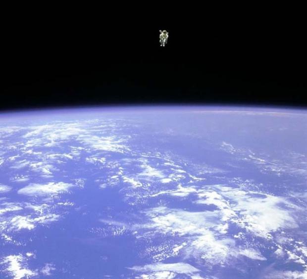 Phi hành gia Bruce McCandless II bay trên thế giới mênh mông vô tận của Trái đất nhìn từ không gian vào năm 1984.
