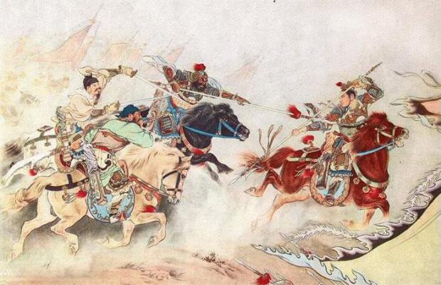 3 anh em Lưu – Quan – Trương và Lã Bố trọng trận Hổ Lao Quan. (Ảnh: Internet).