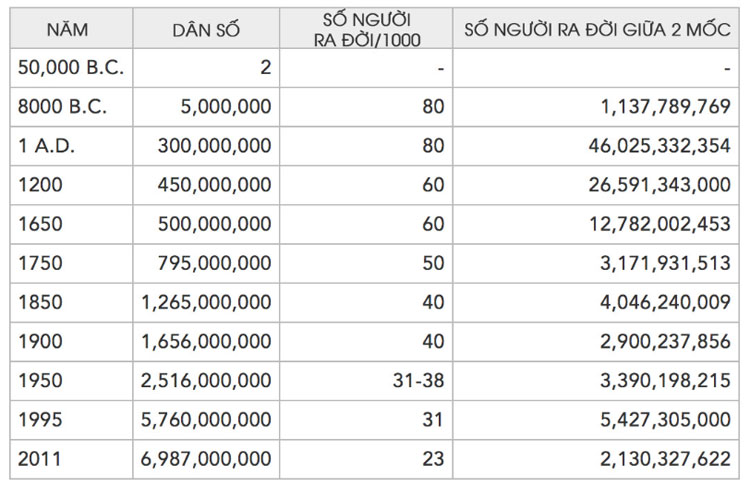 Thú vị hơn, chúng ta có thể thấy rằng tốc độ tăng dân số từ năm 1 tới năm 1650 khá chậm do ảnh hưởng của sự kiện bùng phát bệnh dịch hạch. Sang thời kỳ cách mạng công nghiệp cho tới hiện tại, dân số bắt đầu bùng nổ cho tới giờ. Từ năm 1850 tới nay, danh số thế giới đã tăng gấp 6 lần. Tất nhiên, trên đây chỉ là những ước tính mang tính tương đối dựa trên tỷ lệ tăng dân số, tỷ lệ sinh,... cùng các sự kiện tác động. Tuy nhiên nó cũng phần nào cung cấp được thông tin về lịch sử phát triển của nhân loại từ thuở xưa tới nay.