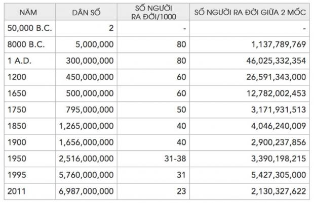 Vậy làm thế nào các nhà nghiên cứu có thể đưa ra các ước tính này? Đầu tiên cục điều tra dân số Mỹ (PRB) chọn năm 50.000 trước công nguyên là mốc đầu tiên. Đây là thời điểm Homo Sapiens hiện đại xuất hiện. Các nhà khoa học vẫn tranh luận về mốc thời gian này bởi một số ý kiến cho rằng họ người bắt đầu xuất hiện trên Trái Đất từ cách đây hàng triệu năm. Tuy nhiên mốc 50.000 trước công nguyên vẫn được chọn bởi PRB và nhiều tổ chức lớn khác chọn.