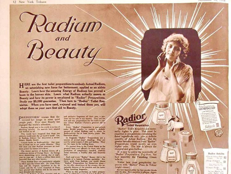 Tuy là một chất độc hại, nhưng từ khoảng những năm 1910 đến những năm 1930, rất nhiều công ty cho ra đời các loại mỹ phẩm chứa đầy chất phóng xạ bán cho các chị em phụ nữ: từ kem trang điểm đến xà phòng hay bùn tắm. Không thể tính được có bao nhiêu người đã mắc bệnh ung thư vì trào lưu làm đẹp kỳ cục này nhưng sau đó, thị trường mỹ phẩm chết người này đã bị đẩy lùi khi người ta nhận thức rõ được tác hại của chất phóng xạ.