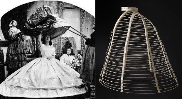 Thịnh hành vào những năm 1850, váy phồng được tạo phồng bởi những bộ khung 'khủng' làm từ gỗ, thép và vải. Bạn hãy tưởng tượng những cô thiếu nữ mặc váy phồng và khoác trên người một bộ khung nặng nề, lắc lư muốn ngã khi có gió to và dễ dáng bắt lửa khi vướng vào lò sưởi.