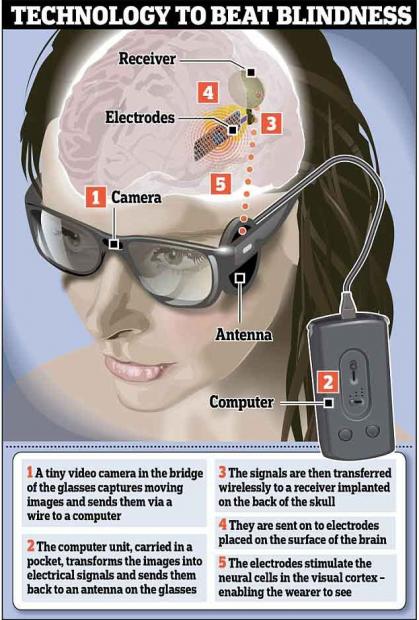 Các bác sĩ tại Đại học California Los Angeles (Mỹ) đang chờ sự cho phép của các cấp có thẩm quyền để kết nối hệ thống với một máy ảnh và một cặp kính có tên gọi Orion I giúp gửi hình ảnh chuyển động trực tiếp đến não bằng cách sử dụng camera của mắt kính.