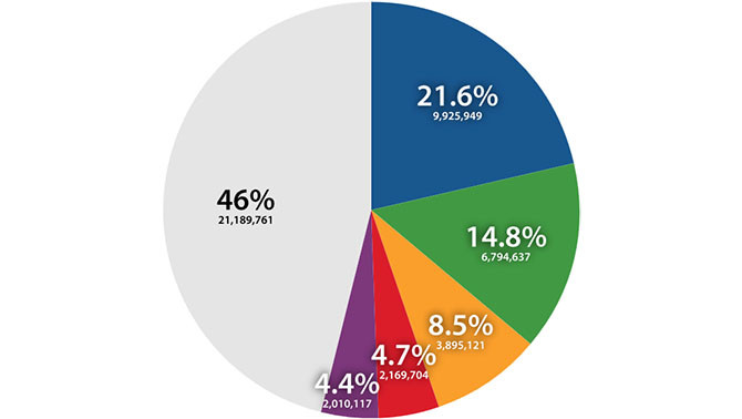 Tỉ lệ các họ trong dân số Hàn Quốc: Kim (xanh dương), Lee (xanh lá), Park (da cam), Choi (đỏ), Jung/Chung (tím).