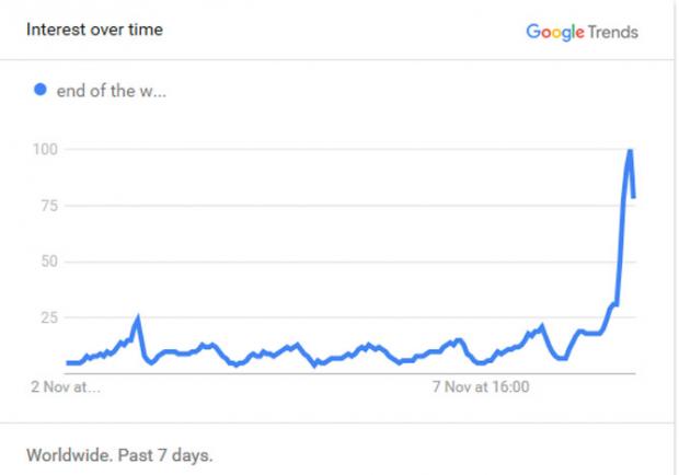 Trong khi đó, một số lượng người lớn lướt web trên toàn thế giới cũng bắt đầu google cụm từ 'ngày tận thế' khi tin tức ông Trump đang trên đường tiến thẳng đến Nhà trắng.