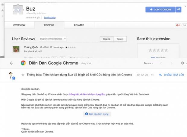 | Tiện ích lừa đảo 'Buz' trên Chrome Store và thông báo gỡ bỏ từ diễn đàn Chrome của Google. |