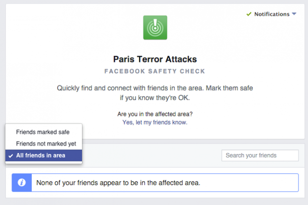 Ngay sau sự kiện Paris hôm thứ Sáu, người dùng có bạn bè ở Paris nhận được một dạng thông báo mới. Facebook kích hoạt tính năng mới tên Safety Check cho những người trong vùng ảnh hưởng, giúp người ở đó thông báo với bạn bè rằng mình đã an toàn.