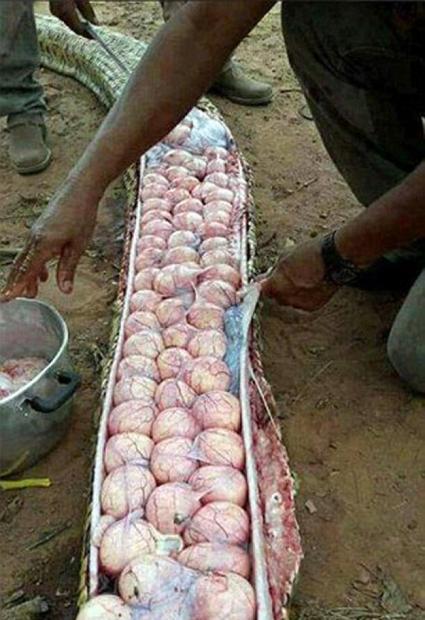 Khi xẻ thịt một con trăn khổng lồ bị nghi ăn thịt con bê trong đàn gia súc, các nông dân Nigeria tìm thấy hàng chục quả trứng xếp chật kín trong bụng con vật, The Sun hôm qua đưa tin. Đây là nguyên nhân khiến bụng con trăn căng phồng. Những người dân làng xem đây là món ăn hiếm, trong khi nhiều người cho rằng giết trăn là quyết định đúng, giúp ngăn chặn sự ra đời của đàn trăn nhỏ.