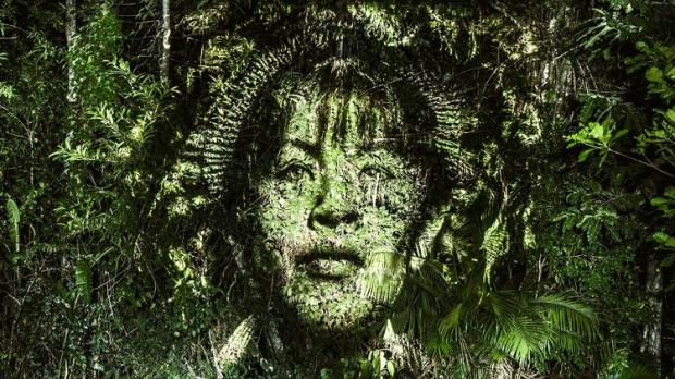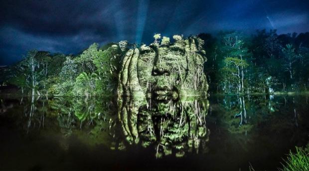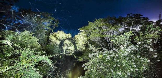 Nghệ sĩ Echaroux đã sử dụng máy chiếu để khắc họa khuôn mặt của những thành viên thuộc bộ tộc Surui lên tán cây xanh um tùm trong rừng Amazon.