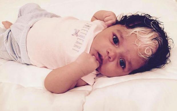 Không chỉ mái tóc, mà cả mảng da phía trước chân của bé cũng trắng bóc giống như vậy. Theo Daily Mail, hiện tượng này do một dạng di truyền hiếm gặp gọi là poliosis gây ra. Dạng di truyền này dẫn đến tình trạng thiếu hoặc không có sắc tố ở tóc, lông mày, lông mi khiến cho tóc hoặc lông bị bạc trắng hoặc trắng thành mảng.